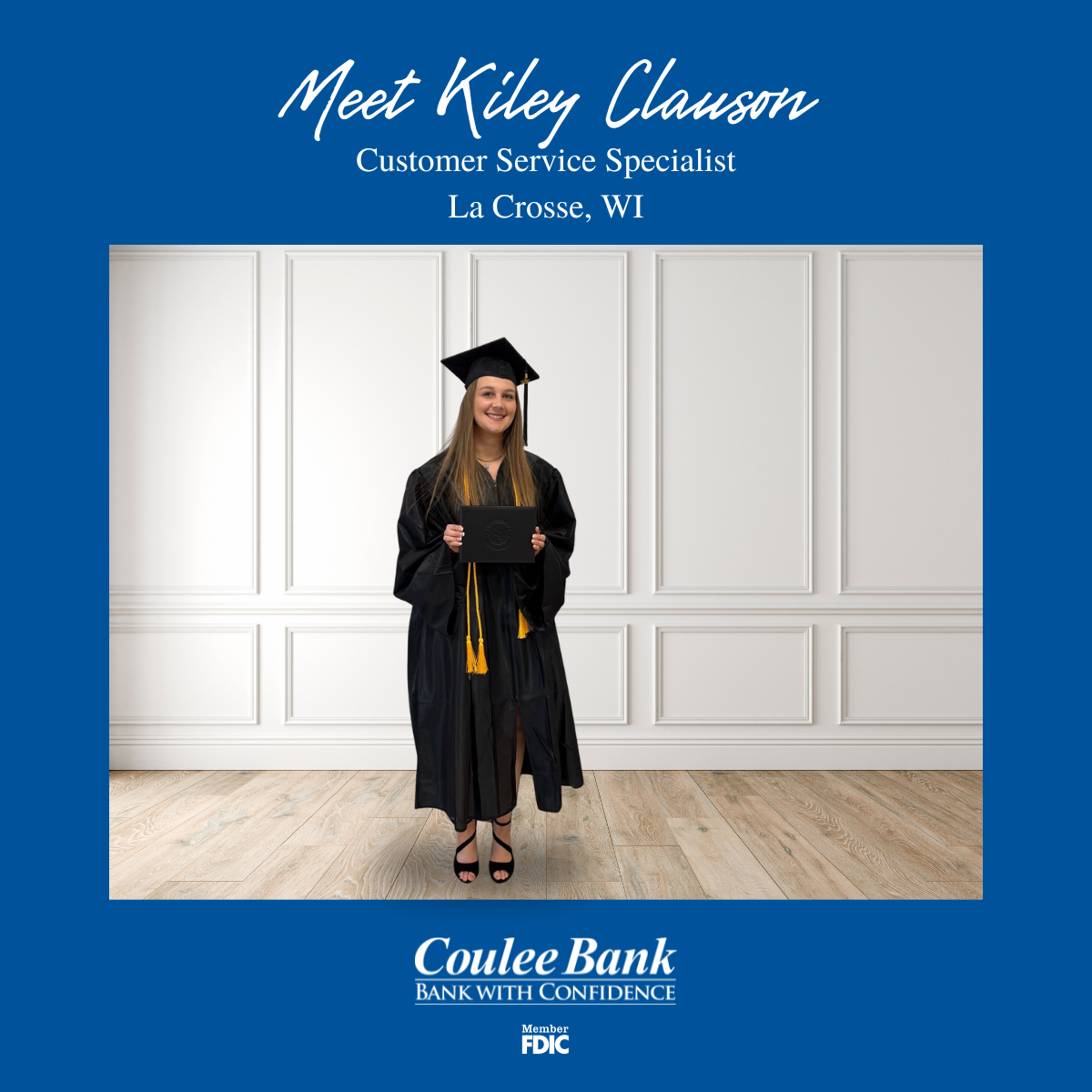 Kiley Clauson, thank you for choosing to work at Coulee Bank. We appreciate your kindness, professionalism, flexibility, and patience! We wish you much success in your career at Coulee Bank.