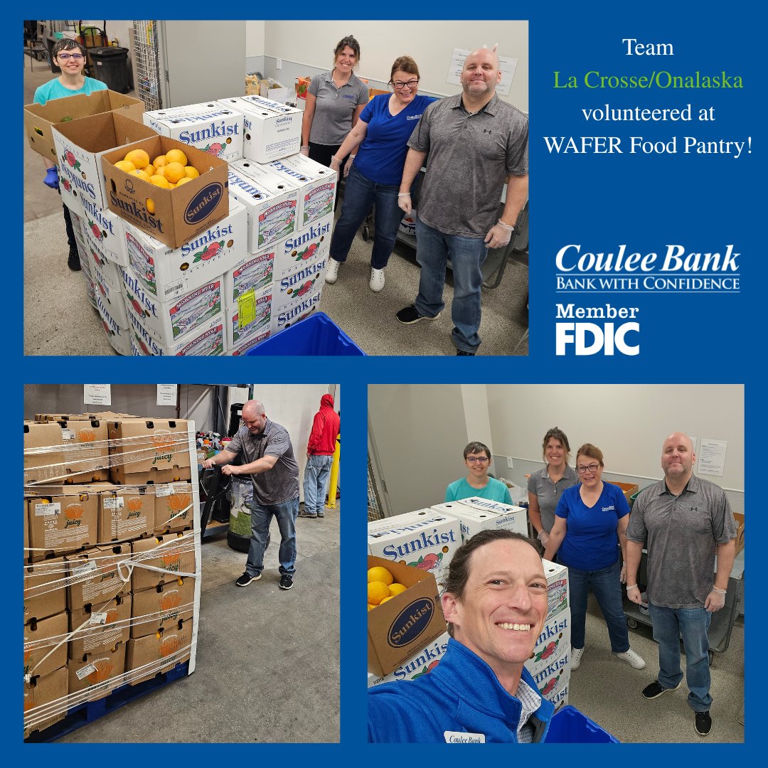 | | Coulee Bank commits to workplace excellence and nurtures growth and support within the communities we consider home. We volunteer, empowered by the belief that we can create positive change! You can be confident in our efforts to support the community. | | Team Rochester helped Paws and Claws Humane Society prepare for their annual rummage sale coming up May 30th - June 1st! We moved lots of boxes, and our reward was spending time with lots of cute puppies and kitties. Great job, Team Rochester! | | What a fantastic day in La Crosse! Our amazing team spent time sorting pallets of juicy oranges and grapefruits, washing windows, walls, and floors at WAFER Food Pantry. Thank you for giving back to the community! | | |