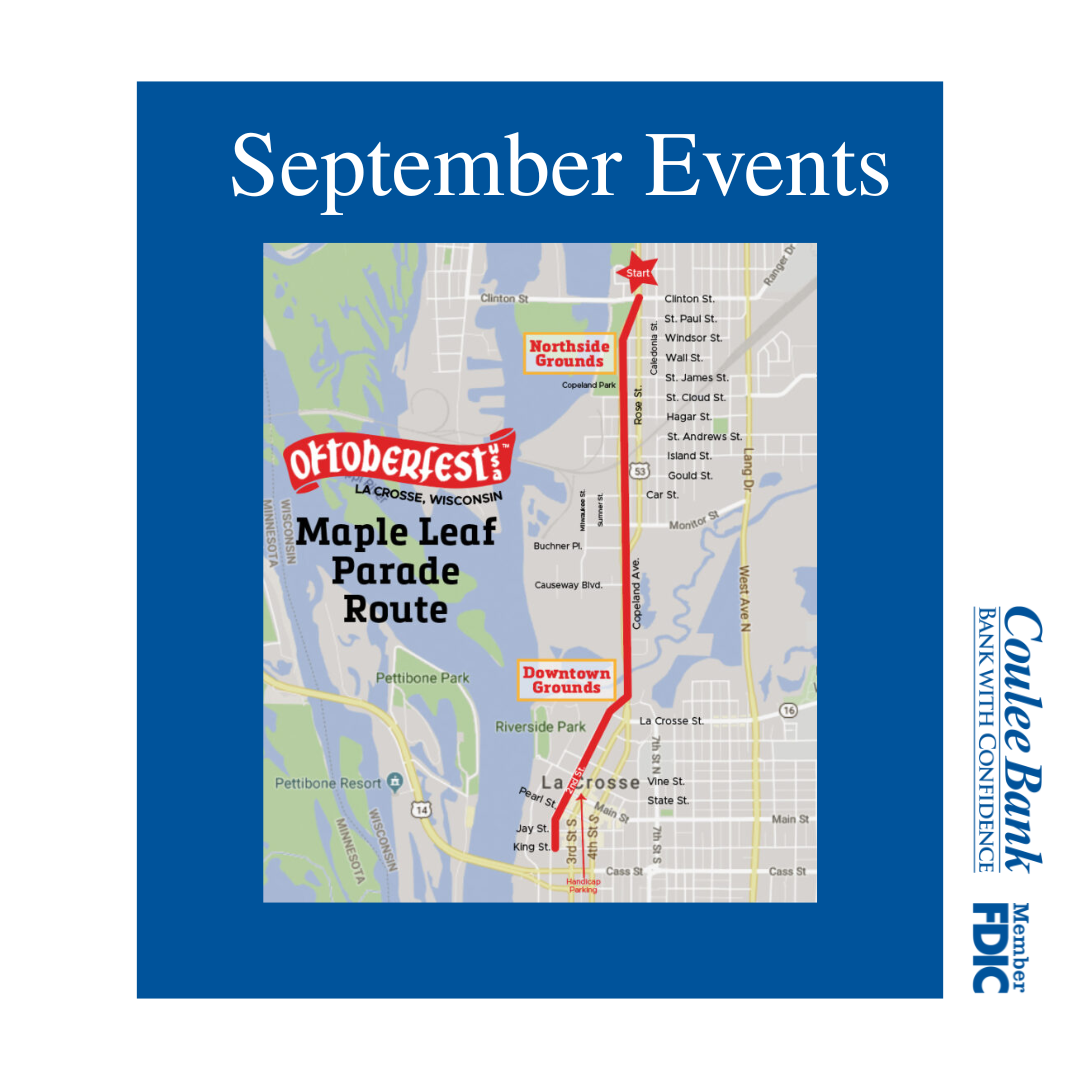 Coulee Bank is proud to sponsor the broadcast of the Maple Leaf Parade on September 27, a highlight of La Crosse’s Oktoberfest celebration. For more than 60 years, this beloved Coulee Region tradition has welcomed the arrival of crisp fall air and colorful autumn leaves. Each year, thousands of families and friends gather along the 2.2-mile parade route, lawn chairs and snacks in hand, to enjoy the sights and sounds as the parade winds through the heart of the city.