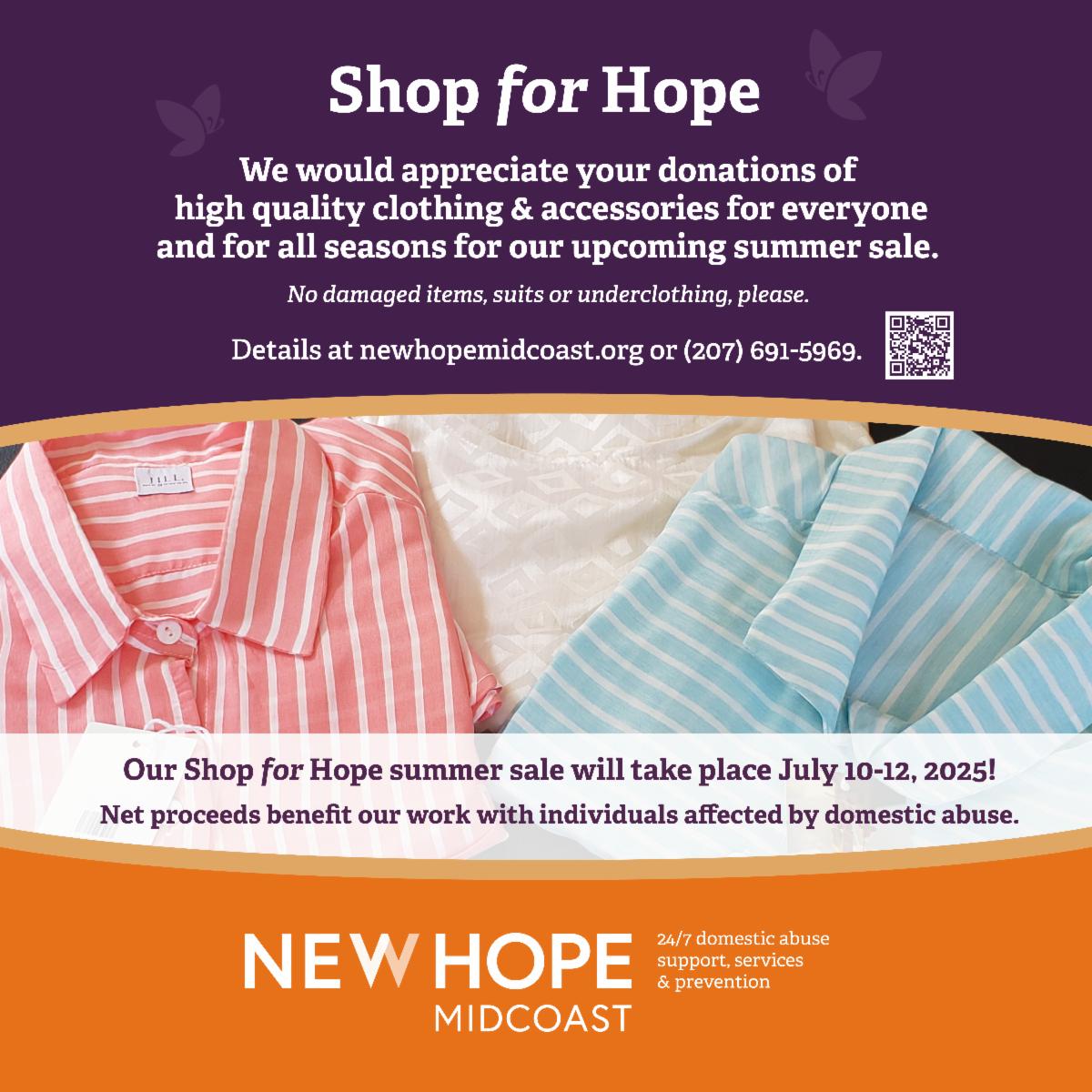New Hope Midcoast, the Regional Domestic Violence Resource Center serving Midcoast Maine, is seeking donations of high-quality clothing and accessories from now through June 30th. Items will be resold at the annual summer Shop for Hope event to be held July 10-12 at the Flanagan Center in Rockland.