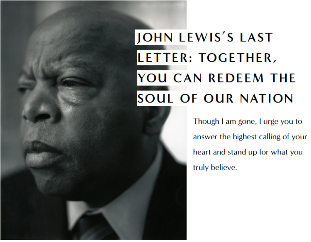 Published on the day of his funeral, civil rights icon John Lewis urged a new generation to carry forward justice through “good trouble” reminding us that democracy is an ongoing act of courage and love.