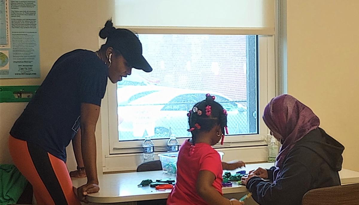 Photo: Daisey (left) providing childcare at the CLC during a special summer class for parents.
