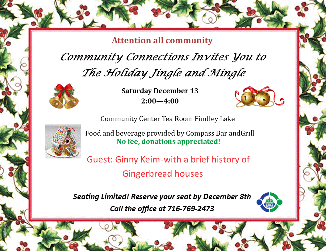 December 13 Community Connections The Holiday Jingle and Mingle 2-4PM. see flyer above. RSVP 716-469-2473 by December 8.