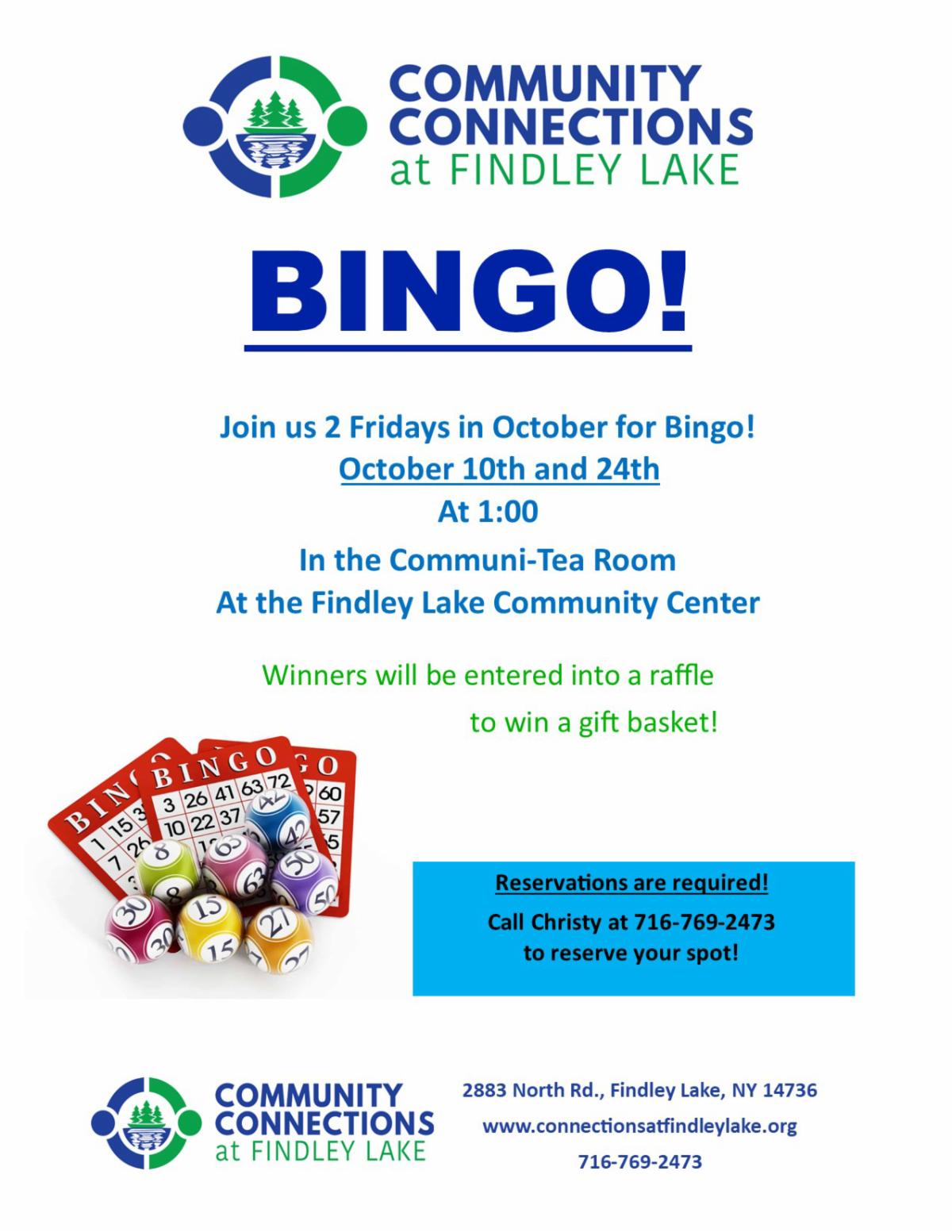 October 10 Community Connections Bingo at 1PM in the Communi-Tea Room. Reservations are required 716-769-2473.
