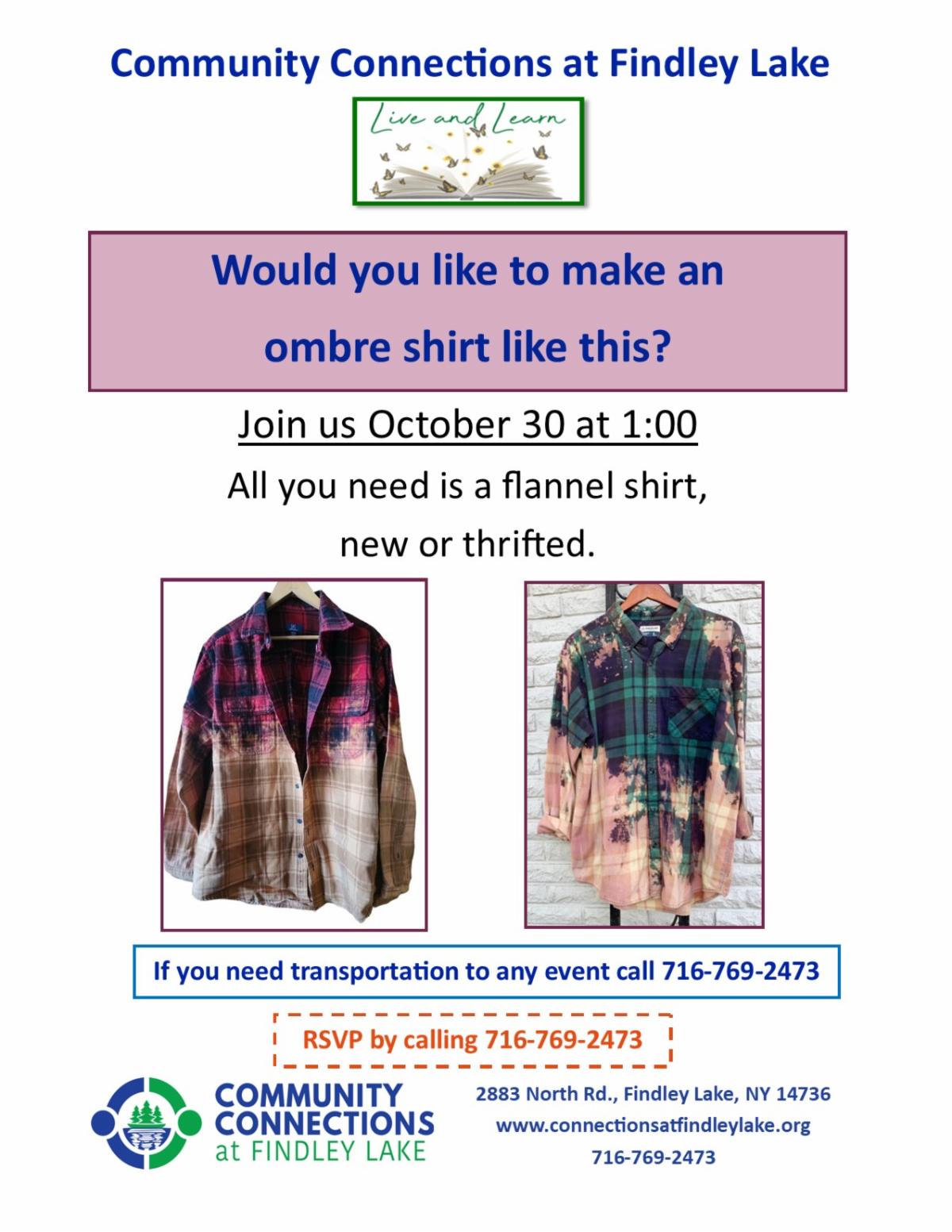 October 30 Community Connections come make an ombre shirt with us at 1PM. All you need is a flannel shirt.