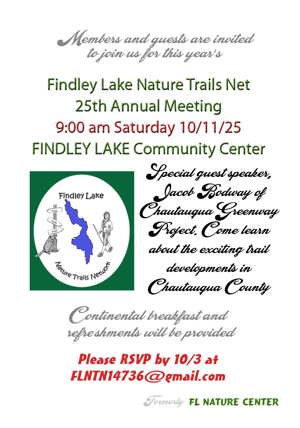 October 11 Findley Lake Nature Trails Net 25th Annual Meeting 9AM at the Community Center. Special guest Jacob Bodway of Chautauqua Greenway Project.