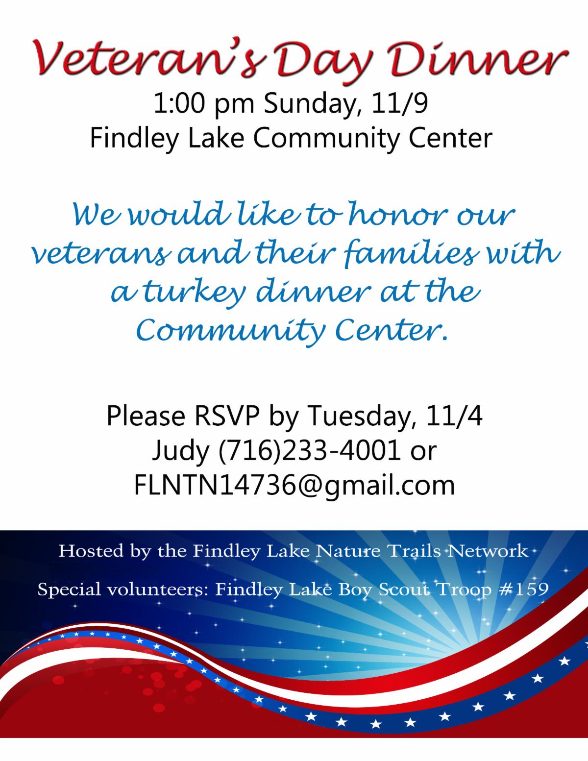 November 9 Veteran's Day Dinner 1PM in the Findley Lake Community Center. Hosted by the Findley Lake Nature Trails Network. RSVP by Tuesday November 4 to Judy 716-233-4001 or FLNTN14736@gmail.com