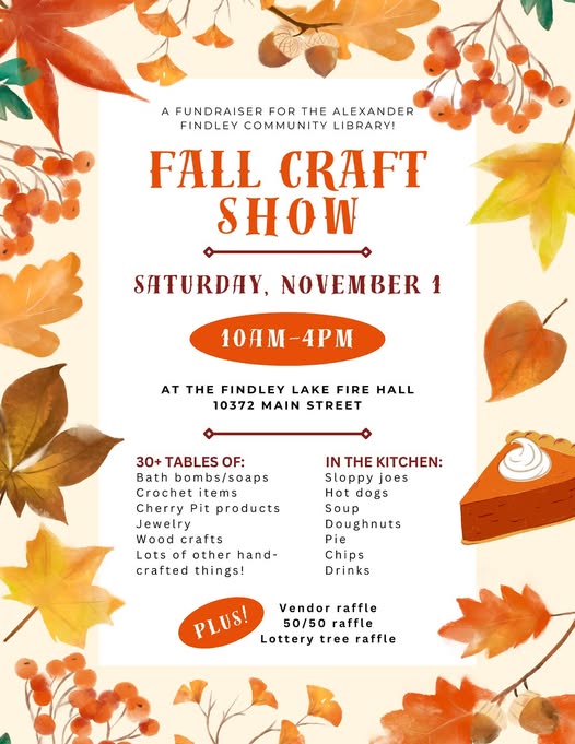 November 1 Findley Lake Library Fall Craft Fair in the Fire Hall 10AM-4PM.