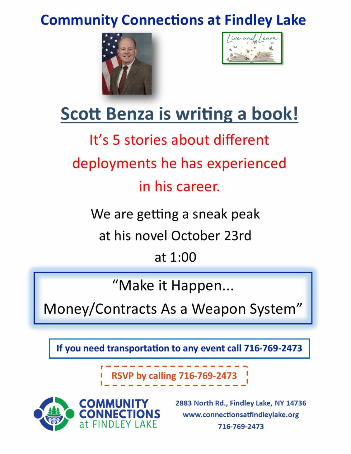 October 23 Community Connections with Scott Benza. Scott is writing a book! Come get a sneak peak at his novel at 1PM.
