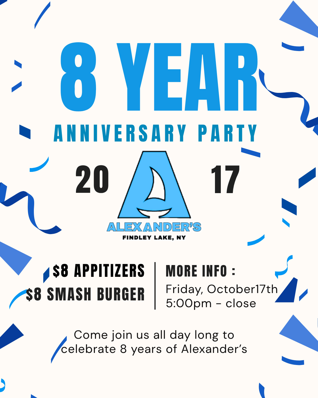 October 17 Alexander's 8th Anniversary Party 5PM-close.