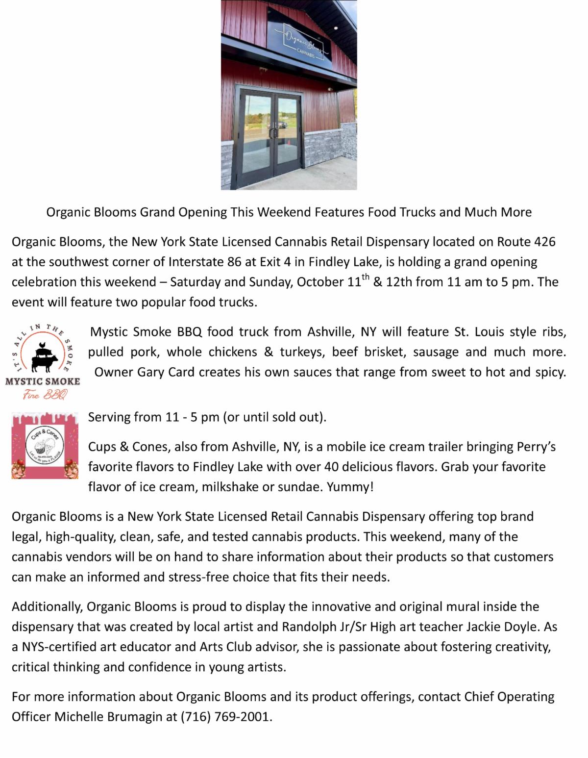 October 11 & 12 Grand Opening of Organic Blooms, NY State Licensed Cannabis Retail Dispensary. See article above.