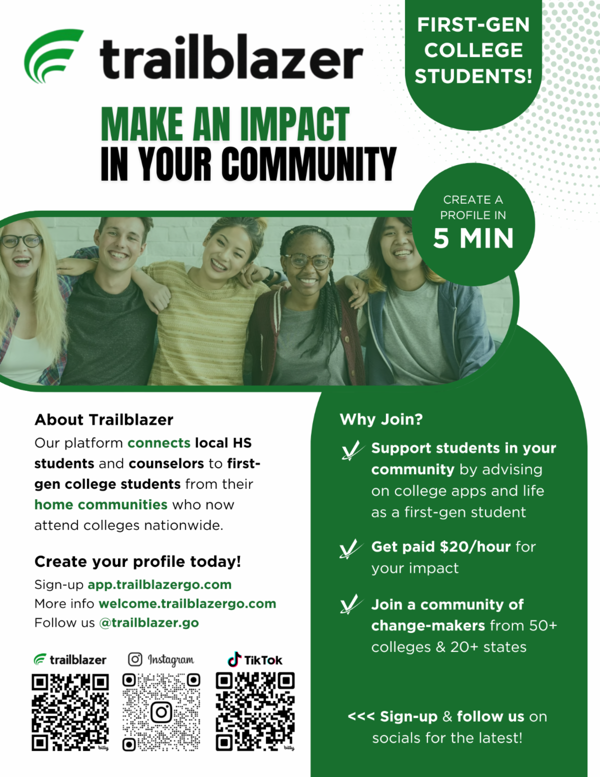 VTEC is partnered with Trailblazer, a platform tapping the power of AI x grassroots community to reimagine college advising. Students/counselors can use Trailblazer's free AI college matching tool to personalize a college list from over 2,700 colleges nationwide. From there, they can connect with first-gen peer advisors - including VTEC-affiliated students - at 50+ universities nationwide.