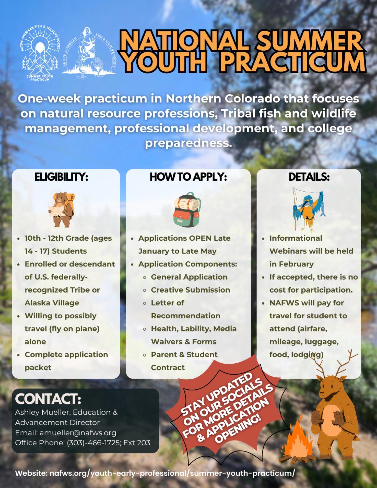 The National Summer Youth Practicum (SYP) is designed to provide Native American and Alaskan Native high school students (ages 14 – 17 years old) an opportunity to gain hands-on and in-lecture experience in the interdisciplinary components of natural resource management and Indigenous knowledge.