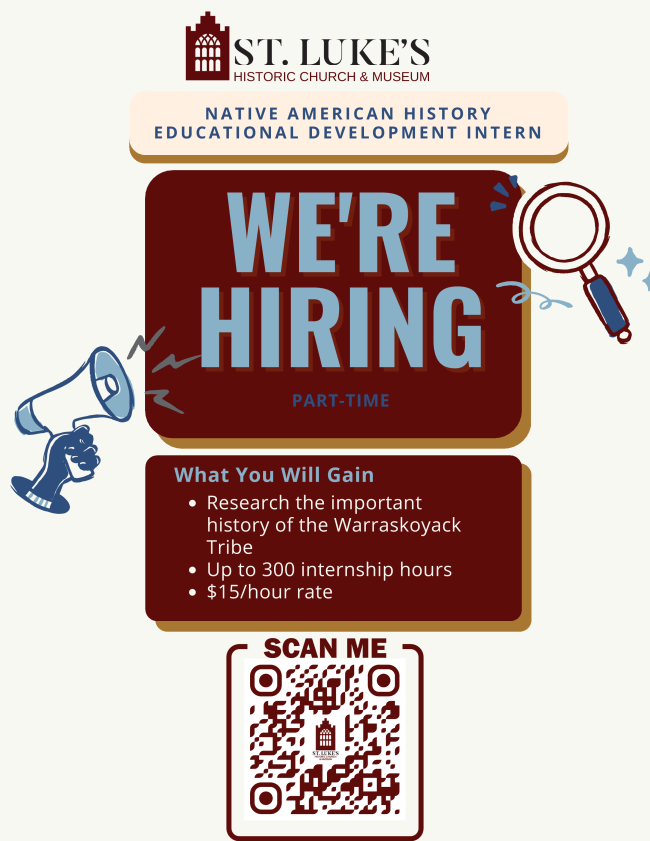 | | Click the flyer above to learn more about the Native American History Educational Development Intern opportunity at St. Lukes Historic Church & Museum. | |