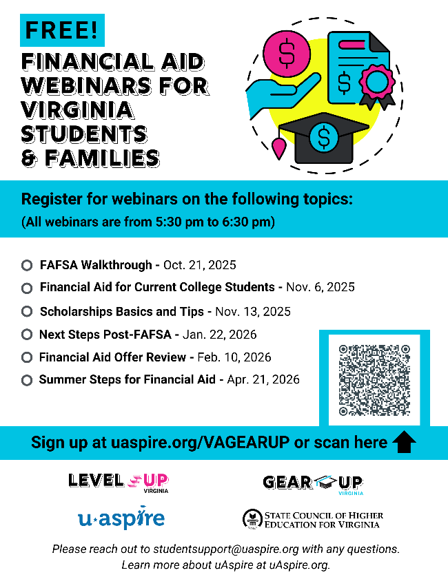 In addition, SCHEV and uAspire are offering a six-part webinar series covering key financial aid topics:
