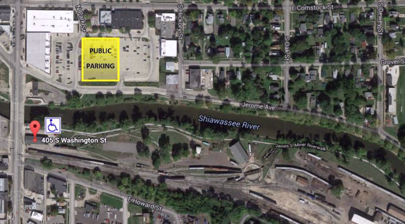 Public parking is available in the public parking lot north of the Shiawassee River, just a short walk over the bridge to SRI grounds.