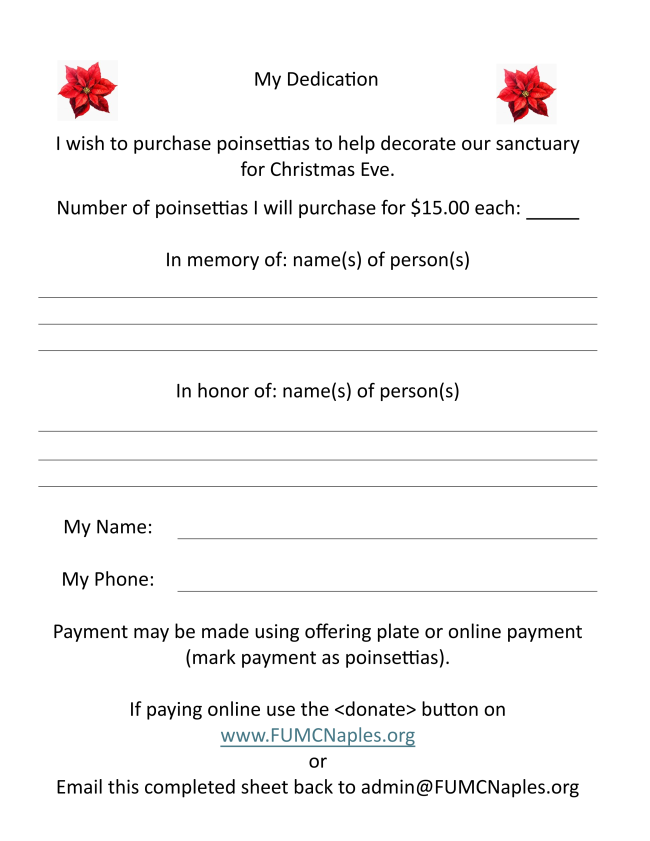 As we prepare our hearts and our sanctuary for the coming of Christ, we are once again offering the opportunity to order Christmas poinsettias in honor or memory of loved ones. Each poinsettia is $15, and they will adorn our worship space throughout the season, adding beauty and warmth to our Christmas celebrations.