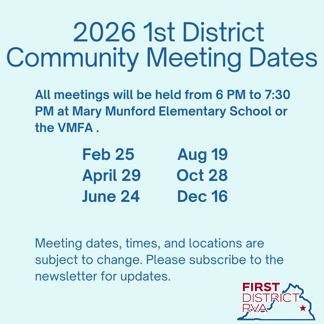 Richmond is finalizing its agenda for the 2026 General Assembly session, working closely with the Mayor and the Administration. After presenting the draft agenda at the October Development Committee, we will soon meet with our General Assembly delegation. However, that has been postponed due to the upcoming special session. In the meantime, you can review the draft agenda and share your thoughts with us and our delegation on the issues you want the City to prioritize.
