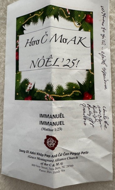 On December 14, our Murphy Smith Building was filled with music, fellowship, and joyful celebration as the Montagnard Christian community gathered for a Christmas celebration that lasted from noon until mid-afternoon. Between 175 and 200 people attended, representing five Montagnard Christian groups and congregations from Charlotte, Raleigh, New Bern, Rocky Mount, and Greensboro. The atmosphere throughout the day was one of deep faith, gratitude, and shared joy.