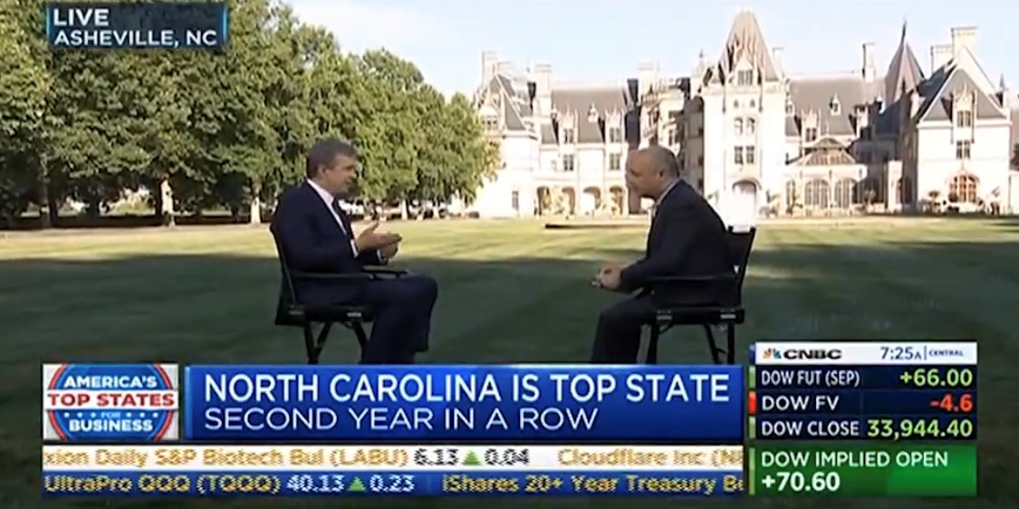 CNBC has named North Carolina as America's Top State for Business in 2023 for the second year in a row. This morning, Governor Roy Cooper joined CNBC's Scott Cohn at the Biltmore Estate in Asheville for a live broadcast where the winner was revealed.