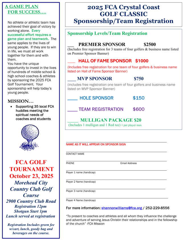 This tournament is one of our largest ministry events of the year. Your participation—as a golfer, team, or sponsor—directly helps us equip and encourage coaches and athletes to grow in their faith and leadership.