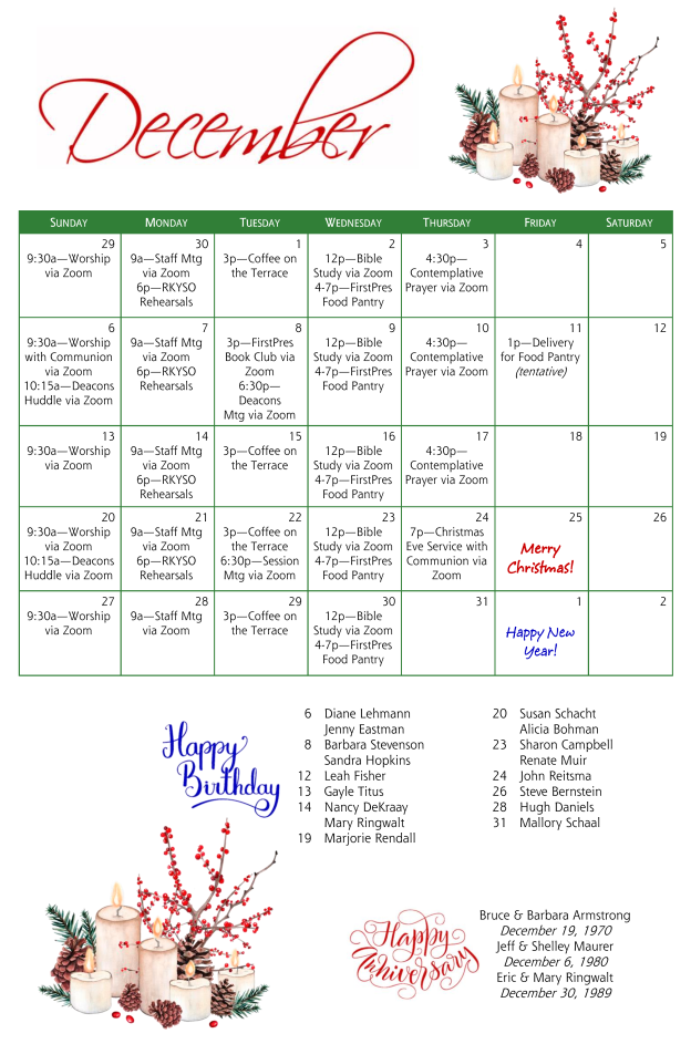 As we come to the end of November, having kept the Thanksgiving Holiday in whatever way we could, taking time to give thanks, I am thankful for the staff and volunteers who have worked to provide worship services throughout this pandemic and who continue to strive to make worship as engaging as possible. But like many of you, I miss the greetings in the hallways and the conversations around the tables in Ihrman Hall. So, the past several weeks, I have been attempting to call every household in the church simply to ask how you are doing. (If you received a phone call from a number you did not recognize, that might have been me.)