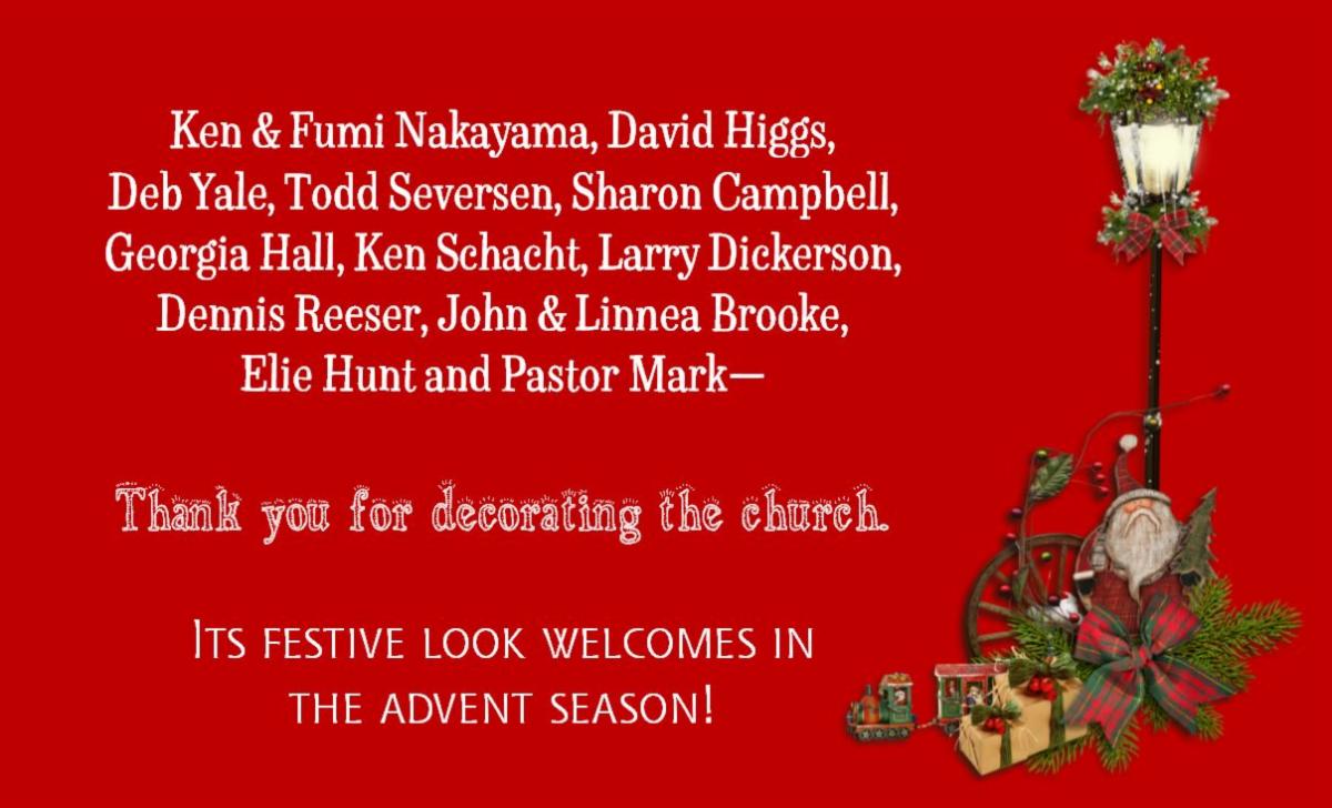 To decorate our sanctuary for our recorded Advent and Christmas Eve services, we have purchased a dozen artificial poinsettia plants and they, along with the new nativity set purchased from memorial funds for Trudy Gibson, will ornament our chancel.