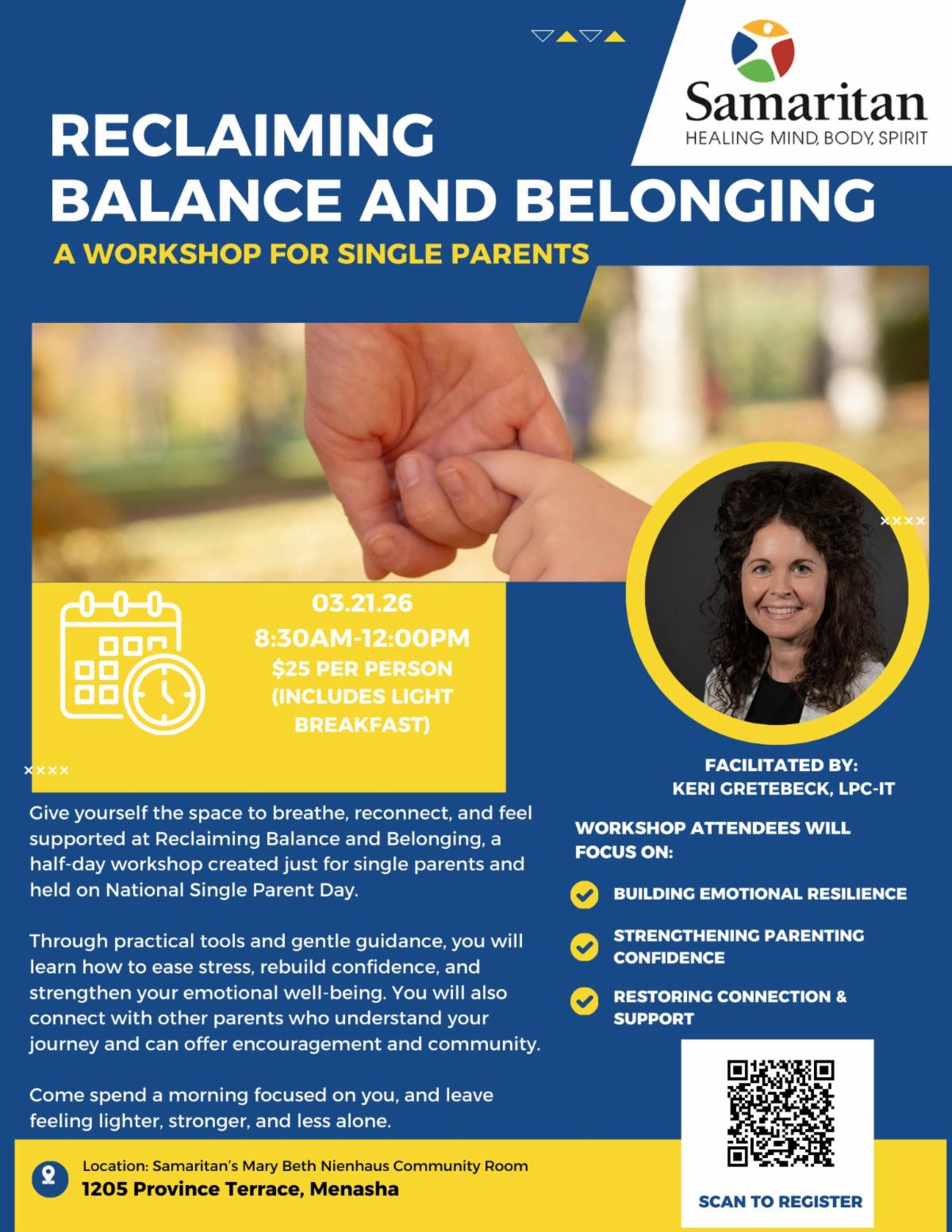 Samaritan has announced a new seminar created specifically for single parents in the Fox Valley. Happening on National Single Parent Day for Reclaiming Balance and Belonging, this half-day workshop is designed to help reduce stress, strengthen resilience, and feel supported in community.