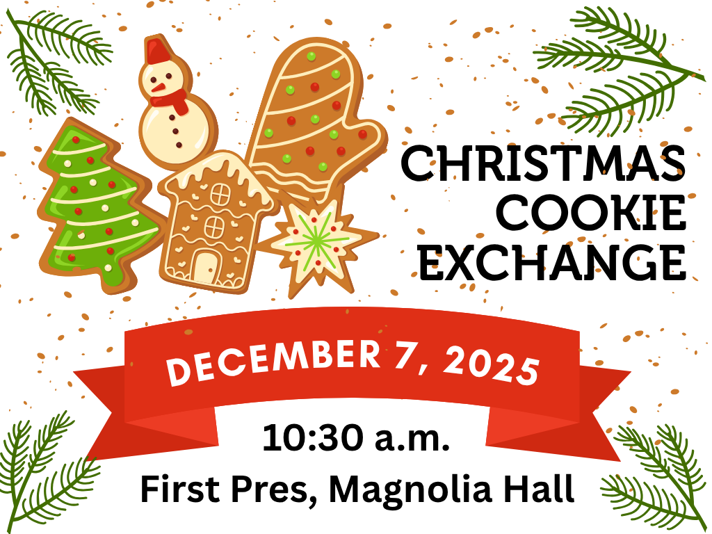 - Drop off on Sunday morning, December 7th, in the “Cookie Exchange” bin next to the hospitality table (by church office)