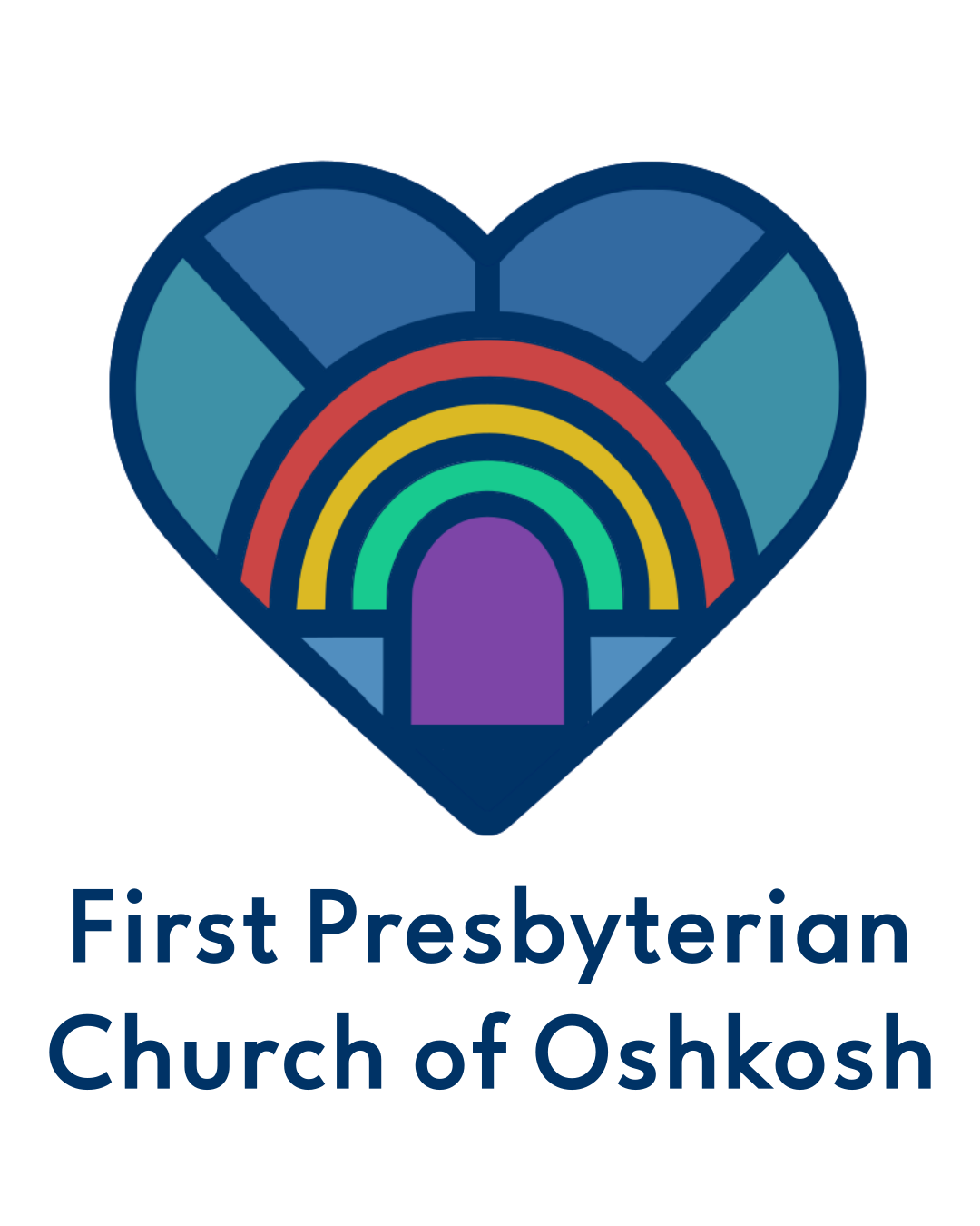 This new logo is designed to reflect the heart of our community. The stained-glass effect of the rainbow and heart shape mirrors symbols we use throughout First Pres Oshkosh, including the beautiful rainbow on our sanctuary door. The deep navy blue pays homage to the cross in the PC(USA) seal.