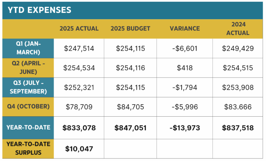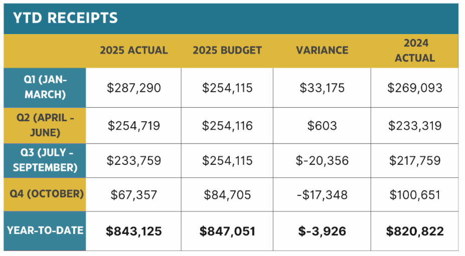 In October, we saw a deficit of $11,352 for the month. After our third consecutive month with a deficit, we are still at a surplus of $10,047 for 2025. After looking at the receipts for the first week of November, we will have already hit 50% of our receipts goal for the month! That is also with five weeks in the month of November. So, it looks like we will have positive momentum to close out the year!
