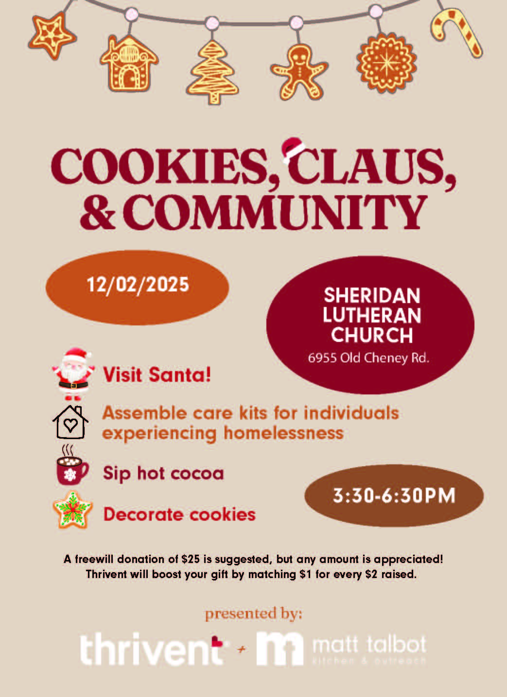 Event activities will include assembling care kits for people experiencing homelessness, decorating cookies, and of course, visiting with Santa. A freewill donation of $25 is suggested, but any amount is appreciated. And, on this special day, Thrivent will boost all donations by matching $1 for every $2 raised.