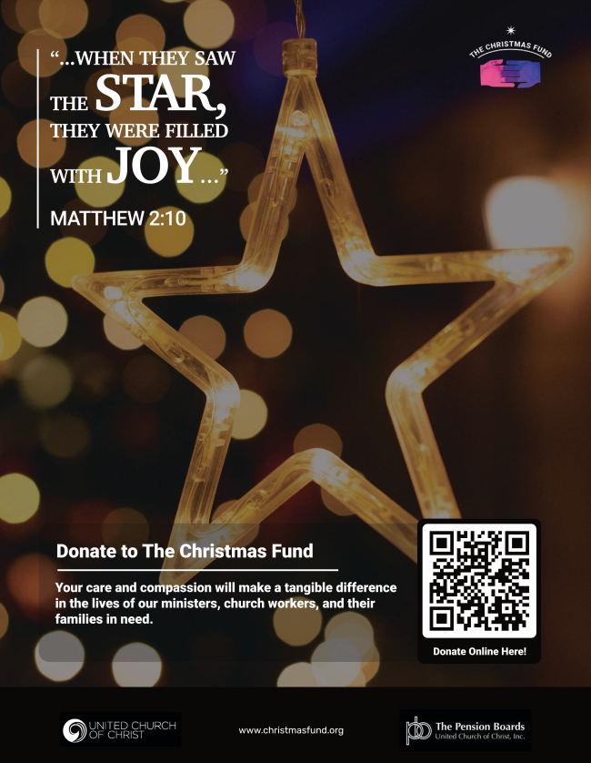 United Church of Christ congregations and members have blessed the Christmas Fund with their generosity for many years. This year, your care and compassion will be especially appreciated by those servants of the church who are facing a time of need, as reflected in the theme of this year: Be the Light! This year’s offering will be collected on December 24th, but donations may be given at any point before Christmas Eve.