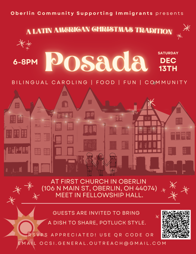 The First Church Outreach and Service Committee is inviting you to join us and other members of our community as we participate in Oberlin’s Ecumenical Carol-Sing on Sunday, December 14th. We will meet in Tappan Square at the flagpole at 3:00 PM. At 3:15 we will move into Oberlin’s downtown and carol in its shops and restaurants until 4:15. Anne Schaum will be our song leader! Caroling song booklets will be provided. At 4:15 PM, we will begin moving to the First Church Fellowship Hall, and we will there savor hot chocolate, apple cider, Christmas cookies, and each other’s company until 5:30 PM.