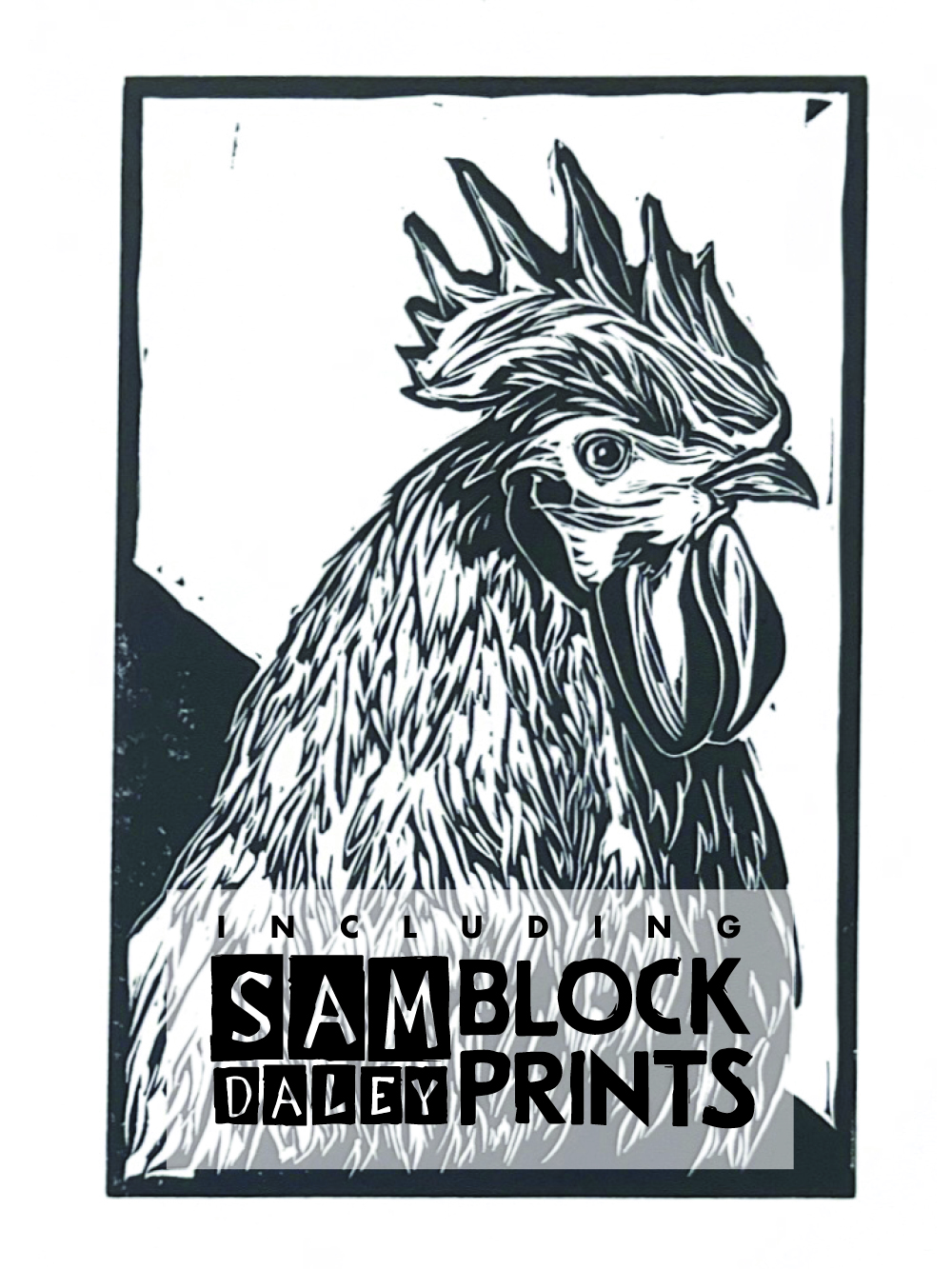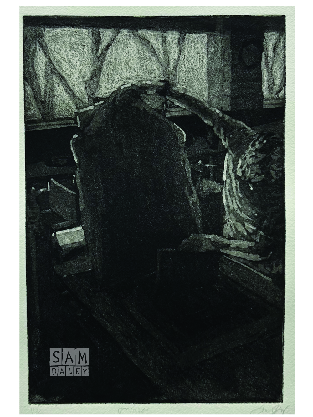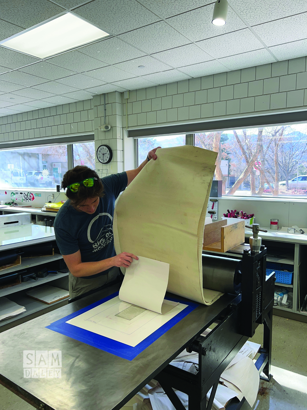 Finishing his junior year, Sam Daley joins us again with new block print art. He has been honing his craft during his several years of art classes at Colorado College. Below you'll see two of his new pieces and a view of him working in the print studio.