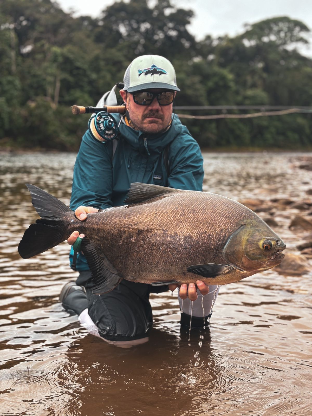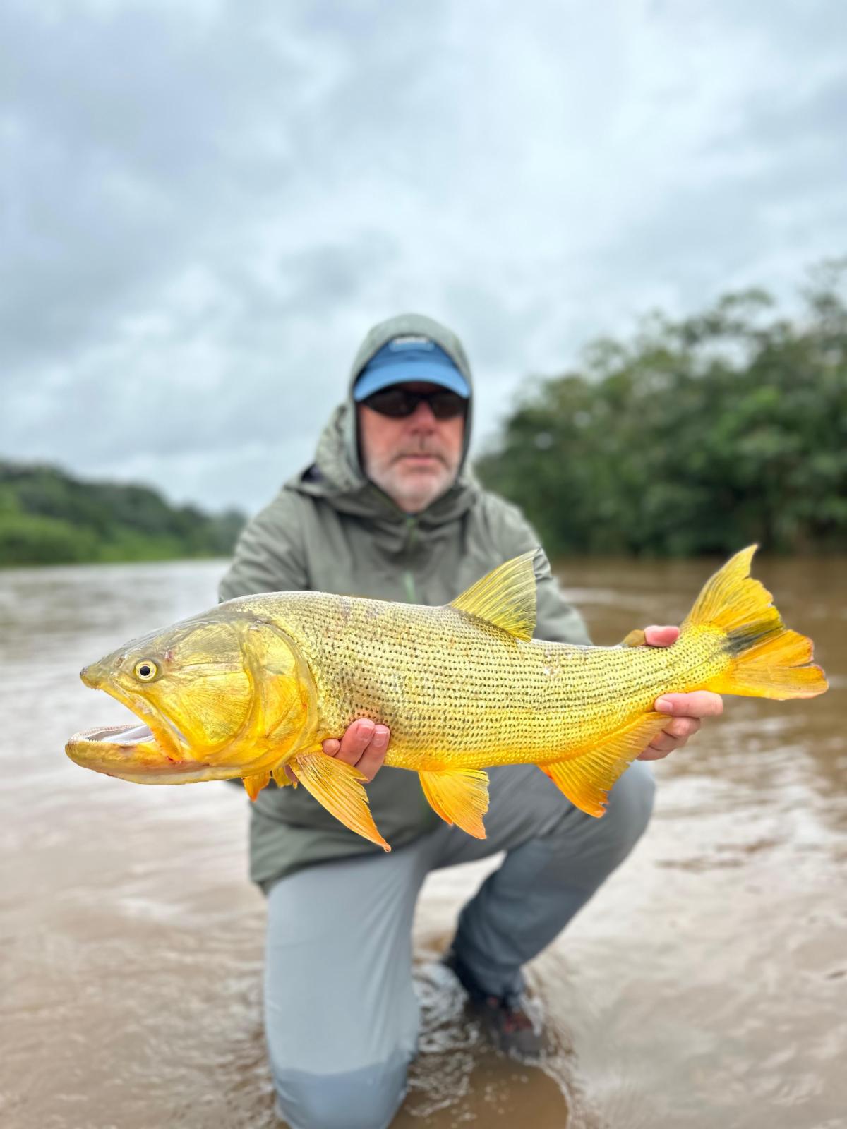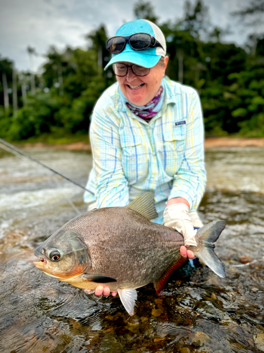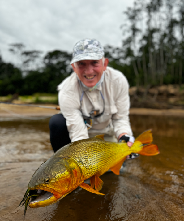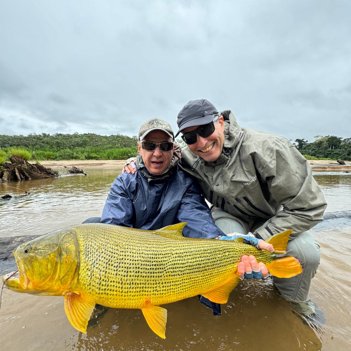 Being persistent and casting all day long under rain and wind finally paid off, with the team landing good-sized dorado in the 8 and 16-lb. range in the lower beats. Despite the low water temperature, we found pacú in the deeper pools with fruit imitation as well as dark, short flies.