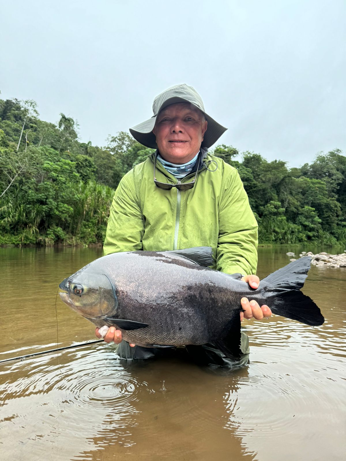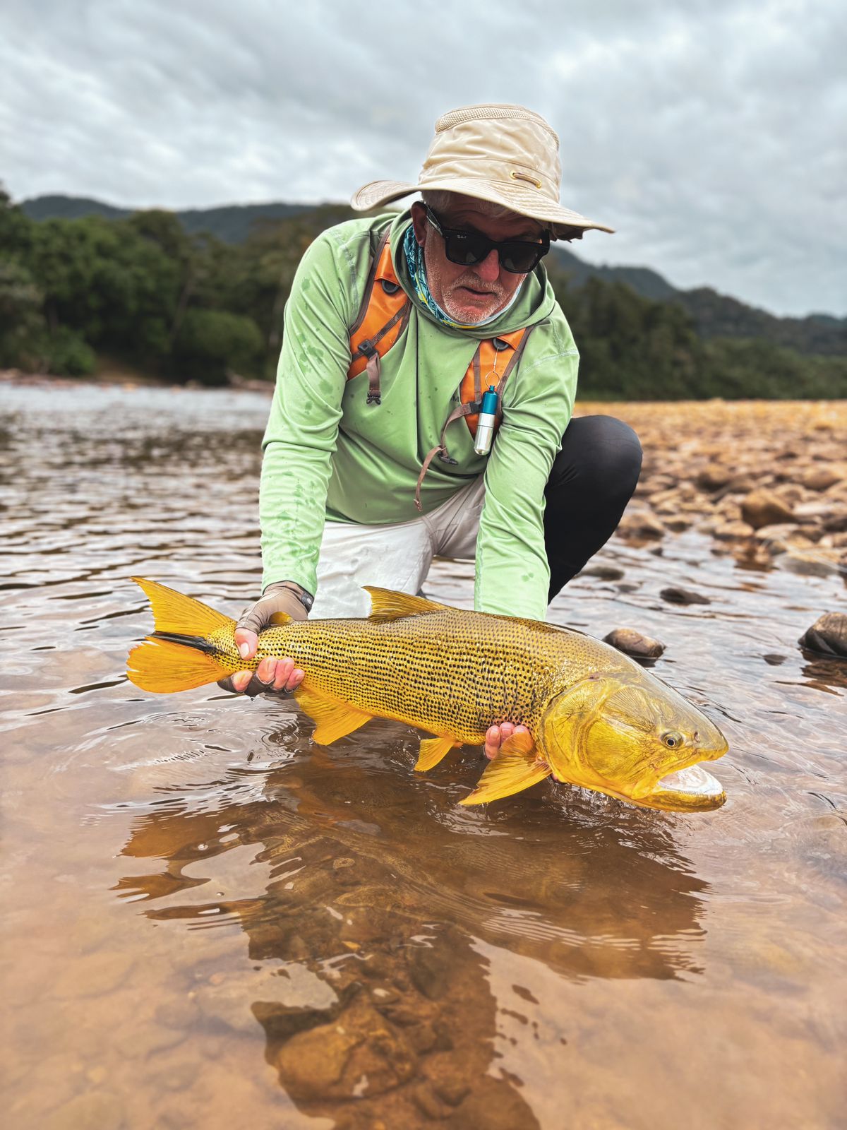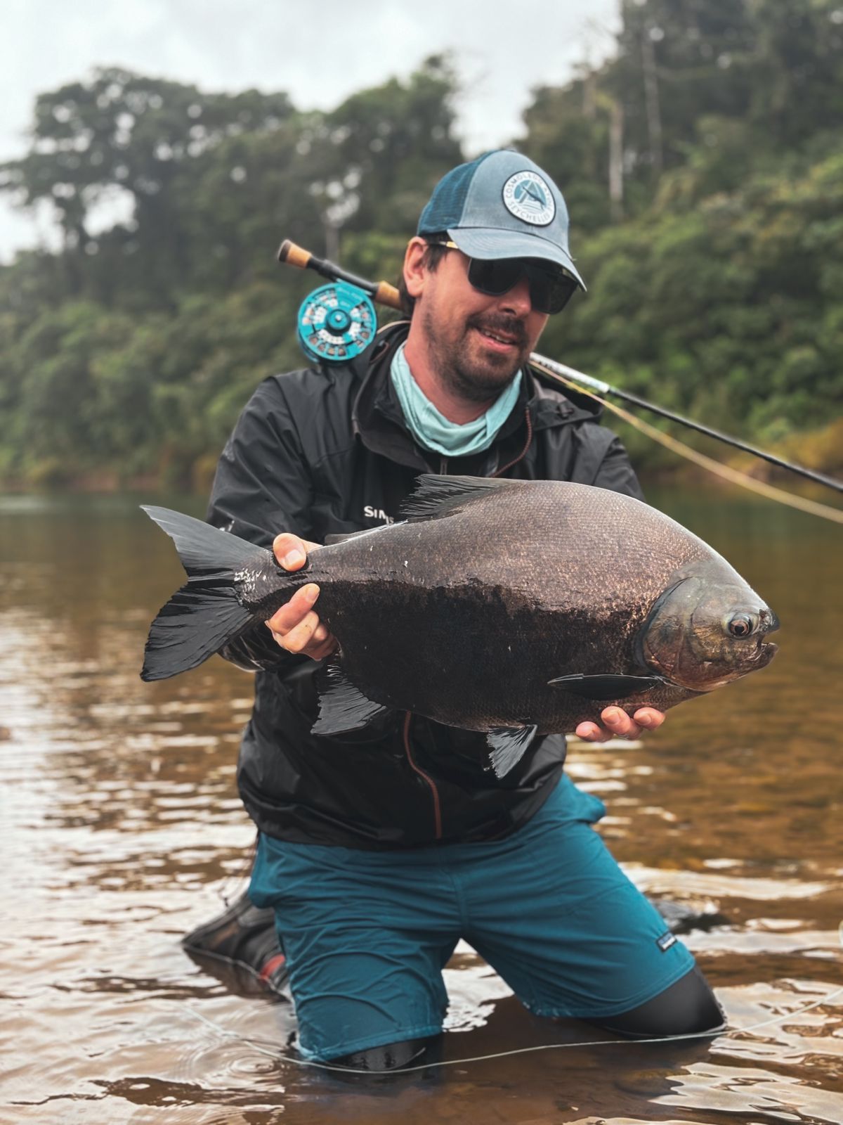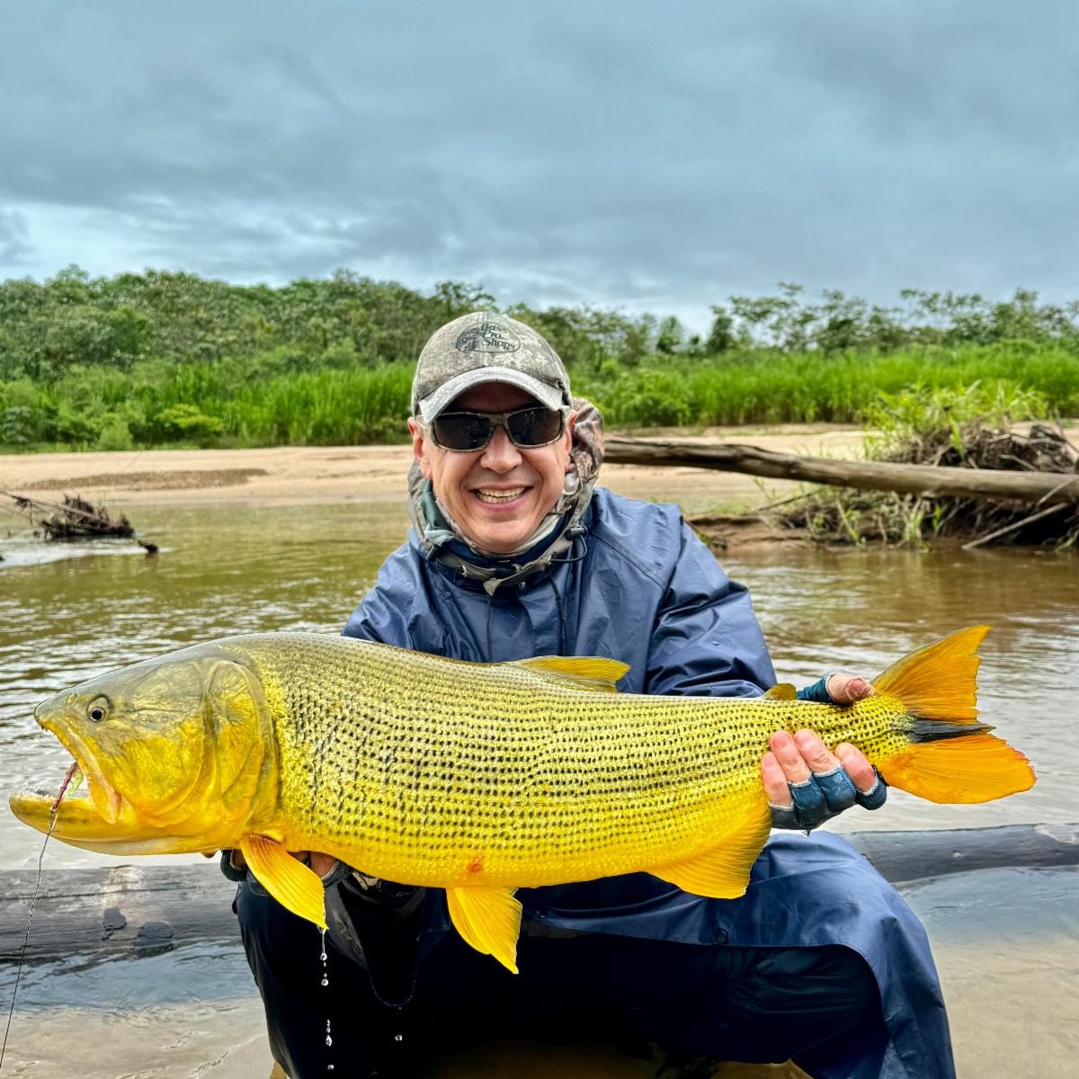 Being persistent and casting all day long under rain and wind finally paid off, with the team landing good-sized dorado in the 8 and 16-lb. range in the lower beats. Despite the low water temperature, we found pacú in the deeper pools with fruit imitation as well as dark, short flies.