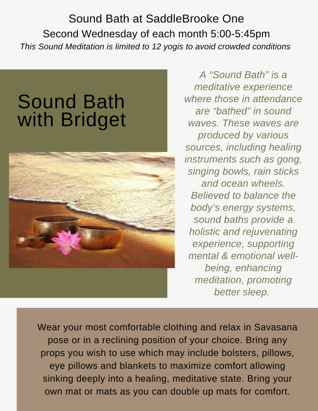 Sound Bath is $10 per attendee, payable to Bridget Bonner in cash, check or via Zelle to Bridget at (520) 991-6556. To sign up send an email to bridgetbonner@rocketmail.com in order to be placed on the attendance list or on the waitlist. You will be notified of your confirmation to attend.