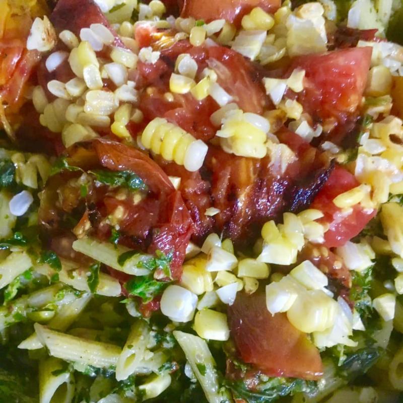 Blend basil with garlic, Romano cheese, lemon juice, olive oil, salt and pepper (nut of your choice, such as pecans or walnuts). While boiling pasta, sear tomatoes on a hot pan or grill along with sweet corn on the cob from Twin Maple Farm until charred.
