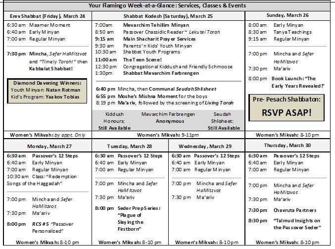 Members of our Chabad Flamingo community unite bi-annually (before Rosh Hashanah and Pesach) to provide food for underprivileged Jewish families. We’ve assembled food boxes for 160 families! Donate funds or time to help pack & distribute. Entirely, 100% of all monetary donations are spent on food only. Packing day is Sunday, April 2, starting at 9:30 am at 6250 Bathurst St (near Steeles) in the social hall on the main floor. (Students can earn volunteer hours!) Take the time for this time-honoured Maot Chitim tradition. For more info or to help, please contact Program Coordinator Sari Bachar: (416) 678-0265 or Yuval Popper: (416)-315-8775.