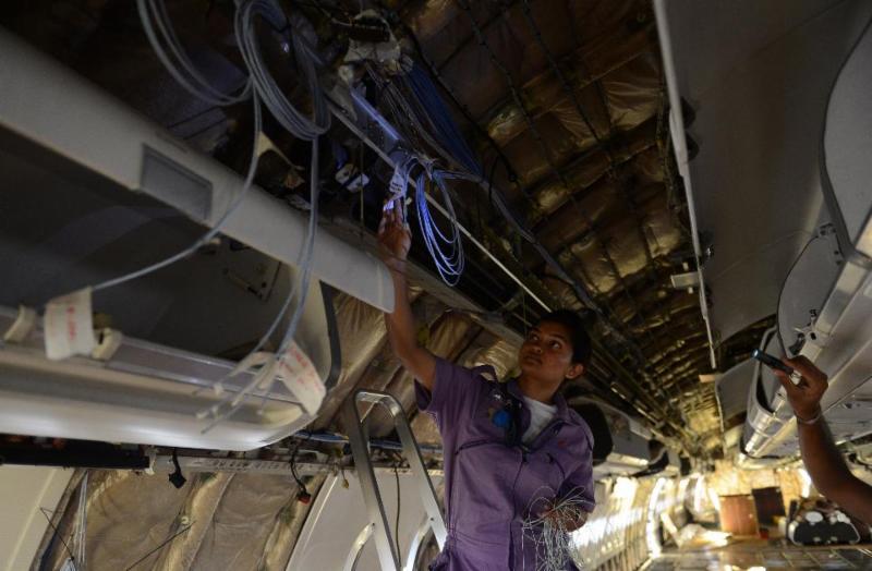 In this photograph taken on November 10, 2014 SriLankan Airlines women technical staff carry out a refit of an Airbus A330 at the main international airport in Colombo. Sri Lanka has decided to build its own aircraft repair, maintenance and overall (MRO) facility targeting regional airlines after scrapping joint venture plans with a German company, officials said November 11, 2014. AFP PHOTO / LAKRUWAN WANNIARACHCHI (Photo credit should read LAKRUWAN WANNIARACHCHI/AFP/Getty Images)