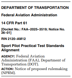 The FAA has recently published the Sport Pilot Practical Test Standards Alignment NPRM. Give it a read and if you see things that can be improved before a final testing standards documents are made, submit your comments.