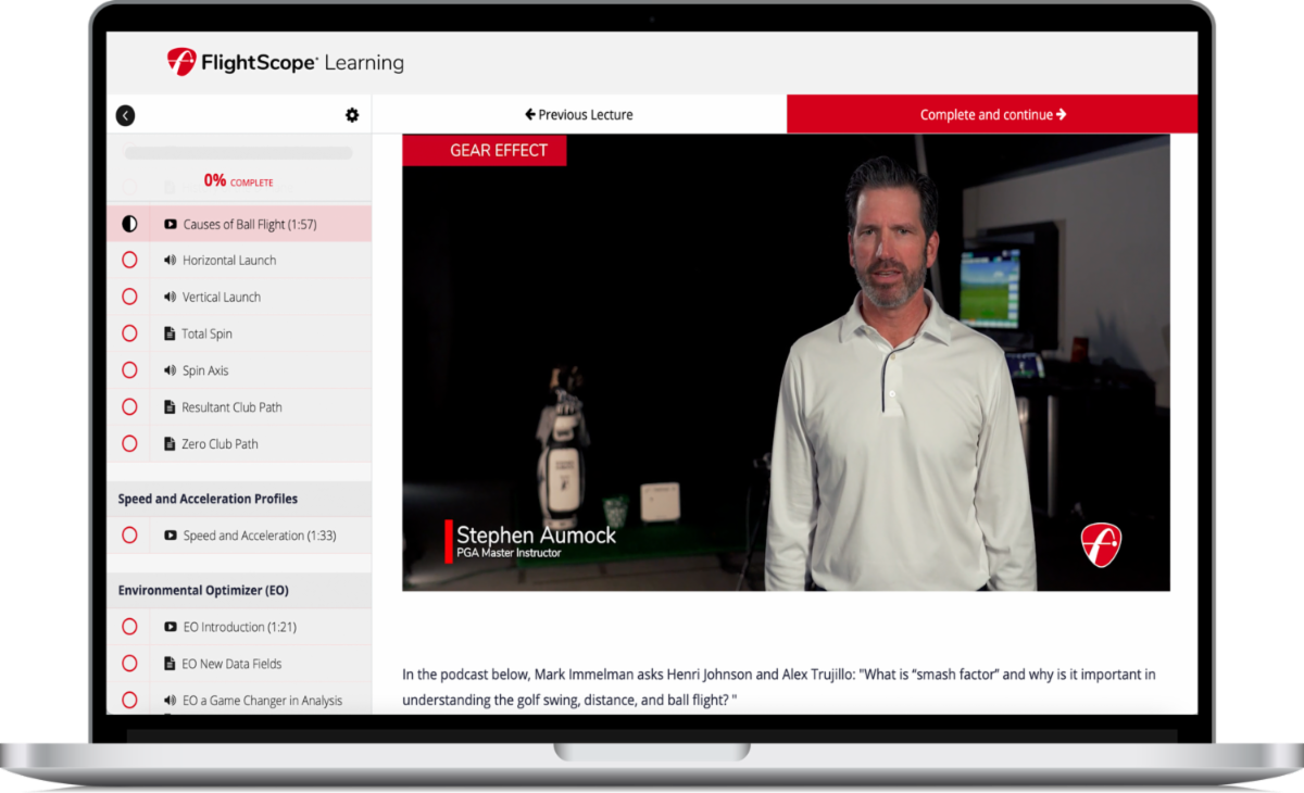 • Access to all written content including setup, data parameter definitions, teaching with FlightScope, fitting with FlightScope, quiz questions, and more.