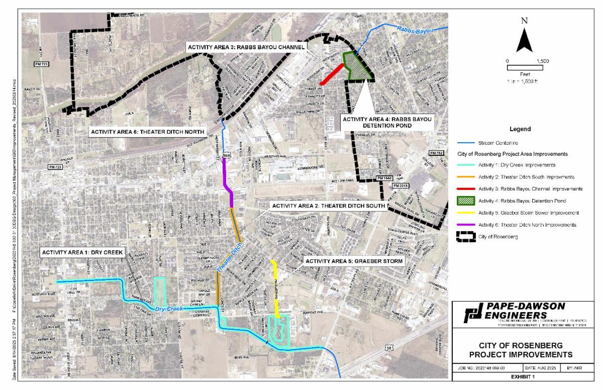 Important flood and drainage improvement construction is currently underway in the City of Rosenberg as part of the Flood and Drainage Mitigation Project. The project includes six construction activities along three major tributaries: Dry Creek, Rabbs Bayou and Theater Ditch, designed to reduce flooding risks to homes, roadways and public safety. Once completed, these improvements are expected to benefit more than 33,455 Rosenberg residents, as well as area schools and businesses.