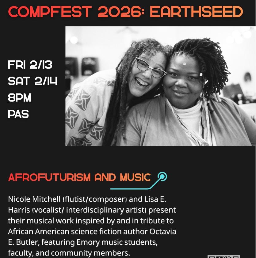 The festival culminates on Saturday 2/14 with a presentation of Mitchell and Harris’s collaborative, evening-length piece EarthSeed, inspired by and in tribute to groundbreaking African American science fiction author Octavia E. Butler. EarthSeed powerfully interprets Butler’s writings through composed and improvised music for instrumental ensemble and vocalists. Mitchell and Harris bring their innovative practices to Emory, presenting the work in an ensemble with local improvisers, faculty members, and Emory students.