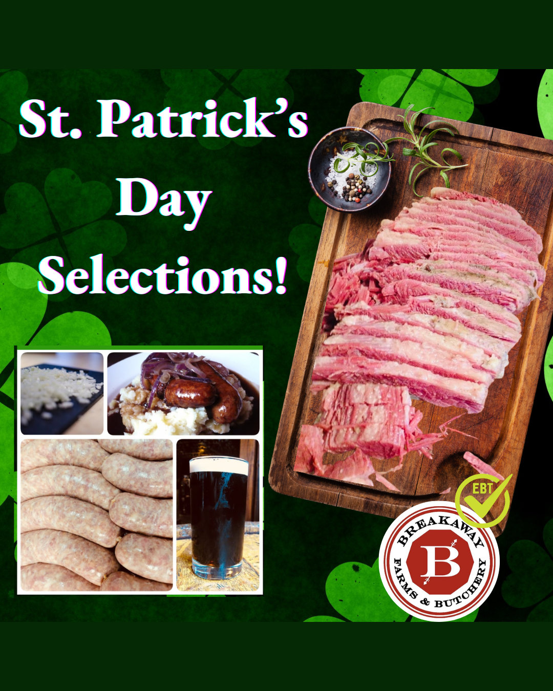 Breakaway Farms has everything needed to celebrate St' Patrick's Day in good taste! Enjoy our 100% Grass-Fed Corned Beef Brisket, Onion Stout Irish Bangers & English Bangers this weekend and commemorate the luck of the Irish with every bite!