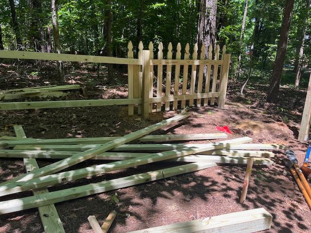 Ben's team identified grave sites, removed brush and trees, built a picket fence around the site, and mulched a path to it. While three graves are identified with markers, wooden crosses will be made for unmarked graves.