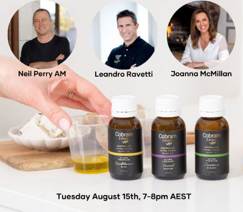 Advanced Tasting, with Chef Neil Perry AM, Chief Oil Maker and Joint-CEO Leandro Ravetti, hosted by Dietitian Dr Joanna McMillan - tasting of Ultra Premium single varietal range, plus how to make restaurant quality food at home from Perry and Ravetti. Bonus sample of Truffle Infused EVOO.