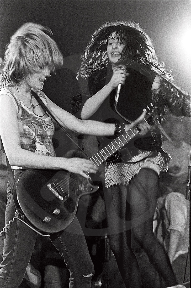 The Slits Viv Albertine and Ari Up perform at Foxes Greyhound, England,1977. Photo by Greg Smith