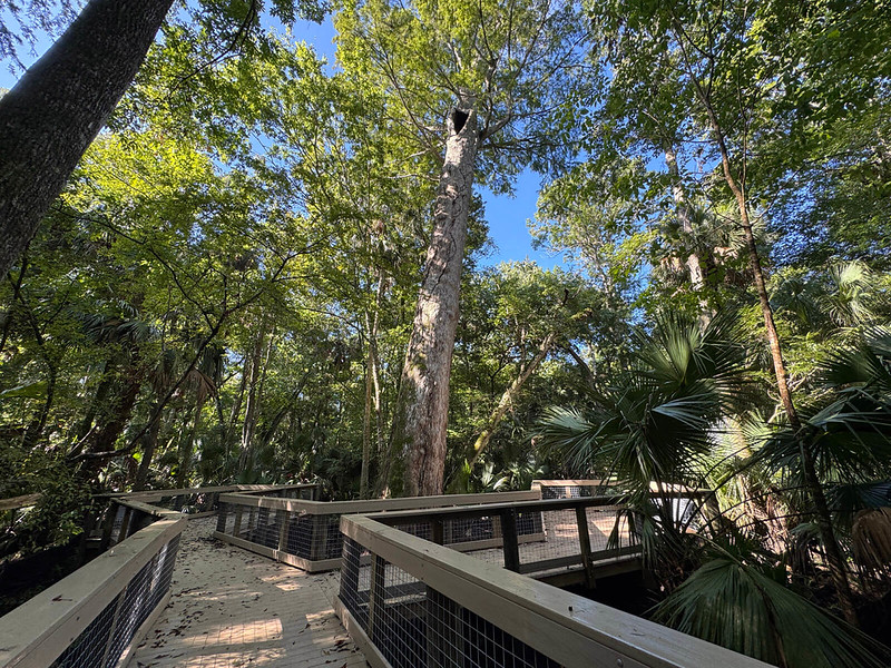 Accessible pathways and boardwalks wind through an old-growth floodplain forest to a scenic overlook of Lake Jesup, passing massive cypresses and a cloudy blue spring along the way.